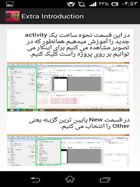 خبرنامه دانشجویان ایران: اندروید محبوب ترین سیستم عامل موجود برای تلفن های همراه هوشمند است، اصلی ترین دلیل محبوب بودن این سیستم عامل امکان طراحی نرم افزارها و بازی های کاربردی مختلف به دلیل سبک برنامه نویسی آن است، حال اگر دوست دارید که برنامه نویسی اندروید را به صورت رایگان فرا بگیرید و برنامه های مورد نظر خود برای سیستم عامل اندروید را طراحی کنید، می توانید با نصب و مطالعه نرم افزار "آموزش برنامه نویسی آندروید" به صورت کامل با سیستم عامل اندروید آشنا شوید و به فوت و فن های آن مسلط شوید. این برنامه شامل پروژه های کاملی از سطح مبتدی تا حرفه ای است، روش کار به این گونه است، که ابتدا مقدمه ای کلی از کار را توضیح داده می شود و با توضیح دادن پیش نیاز های لازم کار برنامه نویسی آغاز می شود. همچنین اطلاعات تماس در برنامه موجود است تا شما بتوانید سوالات و مشکلات خود را مطرح کنید.