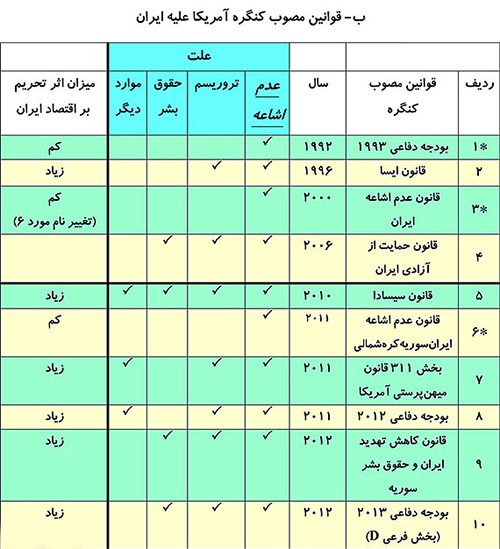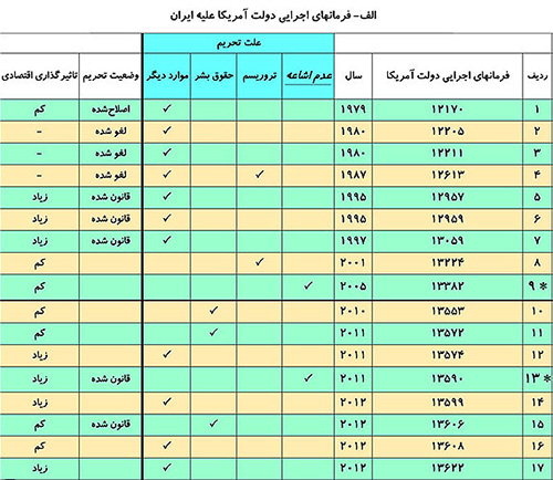 گروه بحران های بین الملل آمریکا جدولی را تولید کرده و 2 لیست ارائه داده است لیست اول دستورهای اجرایی رئیس جمهور و لیست دوم تحریم های کنگره است ستون اول این لیست در ارتباط با مباحث اشاعه سلاح های کشتار جمعی بوده که یکی از آنها بحث هسته ای و بحث شیمیایی است و ستون دوم مربوط به بحث تروریسم و ستون سوم مربوط به حقوق بشر و ستون چهارم مربوط به بقیه موارد است.