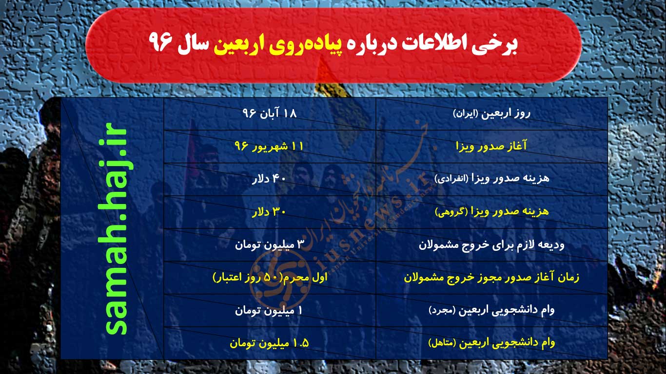 در جدول زیر اطلاعاتی درباره سفر اربعین 96 ارائه شده است: