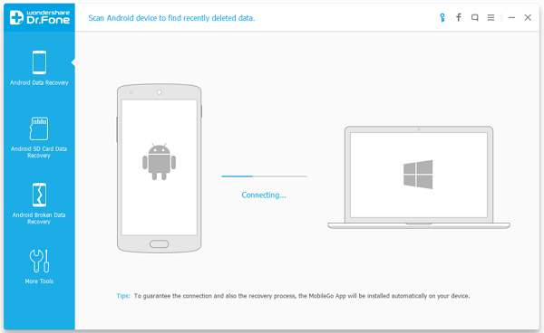 مرحله اول: ابتدا، Wondershare Dr.Fone را دانلود و روی کامپیوتر نصب کنید و دستگاه اندرویدی را از طریق کابل USB به‌کامپیوتر وصل کنید.