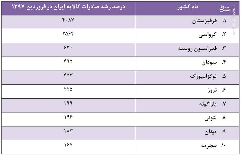 ۱۰ کشور اول از لحاظ رشد صادرات کالا به ایران در فروردین ۱۳۹۷ به شرح زیر است: