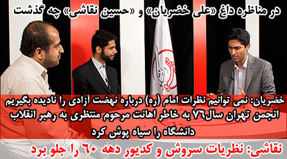 خضریان: بله! 40 روز بعد از دوم خرداد سال 76! در سال 78، یک مناظرهای بین نمایندهی دفتر تحکیم وحدت و نمایندهی انجمن اسلامی دانشجویان شهید چمران و علوم پزشکی اهواز برگزار میشود، سر اینکه چرا شما میخواهید از اتّحادیّه جدا بشوید؟! یک مناظره برگزار میشود... . ابتدای این مناظره، نمایندهی دفتر تحکیم وحدت در نشست، در سالن رو به جمعیّت میکند و میگوید: اول، سه تا صلوات برای سلامتی مقام معظم رهبری بفرستید! من گفتمان حاکم در دفتر تحکیم وحدت در سال 78 را دارم برای شما میگویم؛ یعنی میخواهم بگویم، «مرور زمان» کار را به آن نقطه میرساند! این مرور چه بوده است؟! آقای نقاشی! این مرور، همراه شدن در منافع حزبی و سیاسی خارج از محیط دانشگاه بوده است! این بوده که خانم حقیقتجو از درون دفتر تحکیم وحدت، در لیست انتخاباتی مجلس ششم سال 78 شرکت میکند؛ یعنی همراه شدن با جریان سیاسی خارج از دانشگاه، باعث میشود بخش مهمی از مجموعهی دفتر تحکیم وحدت، چشمش را بر روی معایب سیاسی جریانهای سیاسی اصلاحطلب ببندد و به محاسن و قدرتی که دارد از آن طریق کسب میکند، اهمیّت بدهد و به همین دلیل، اسلامگرایی سقوط میکند و مسائل سیاسی در اولویت قرار میگیرد. اینها باعث میشود که مجموعهی اتّحادیّهی انجمنهای اسلامی دانشجویان مستقل در 13آبان 78 اعلام موجودیّت میکند، از انجمنهای اسلامی عضو دفتر تحکیم! یعنی این طور نبوده که مثلاً در دانشگاه شهید چمران، انجمنی باشد و انجمن اسلامی دانشجویان مستقل بیاید و در کنارش تأسیس بشود! این طور نبوده! انجمنهای اسلامی عضو دفتر تحکیم میآیند این اتّحادیّه را تأسیس میکنند و بر مبنای همان بحثی که شما میفرمایید، بر مبنای دموکراسی، دانشجویان به این انجمن اسلامی رأی داده بودند! آقای نقاشی! چرا ما ناراحت هستیم؟! دانشجویان، به انجمن اسلامیای رأی داده بودند که نمیخواستند در دفتر تحکیم باشد! چه ایرادی دارد؟! چرا شما دموکراسی را تا آنجایی که خودتان قبول دارید، میپذیرید؟! آنجایی که دانشجویان بر خلاف نظر شما رأی میدهند، دموکراسی نیست؟! من حرفی ندارم... .