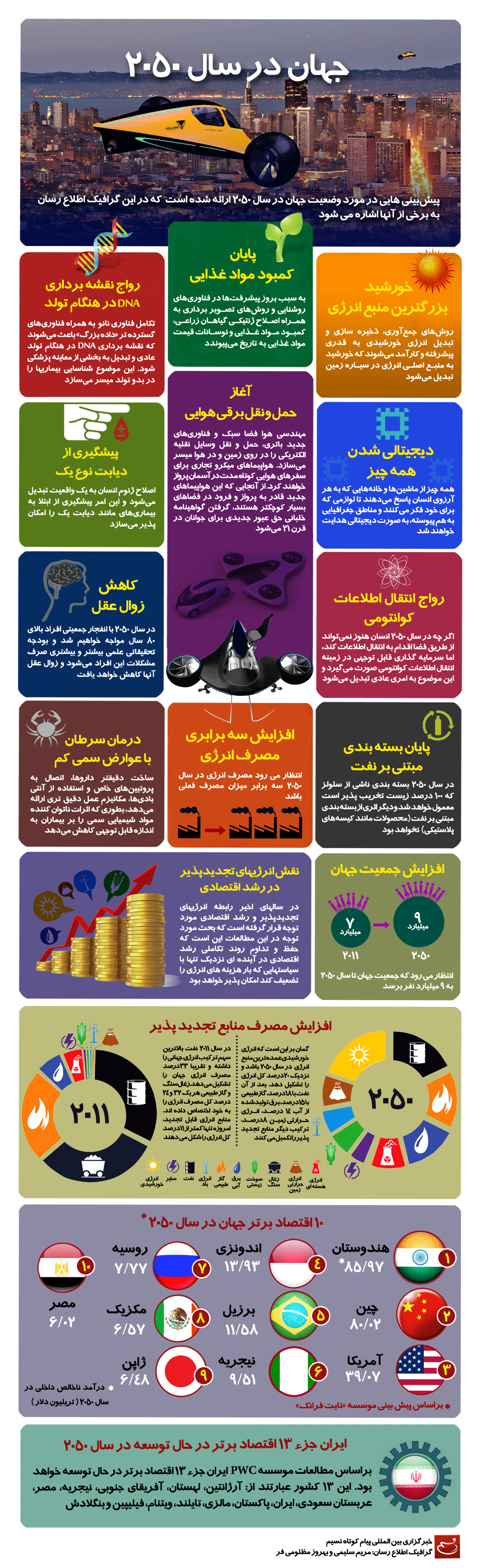 خبرنامه دانشجویان ایران: پیشبینیهایی در مورد وضعیت جهان در سال ۲۰۵۰ ارائه شده است که در این گرافیک اطلاع رسان به برخی از آنها اشاره میشود.