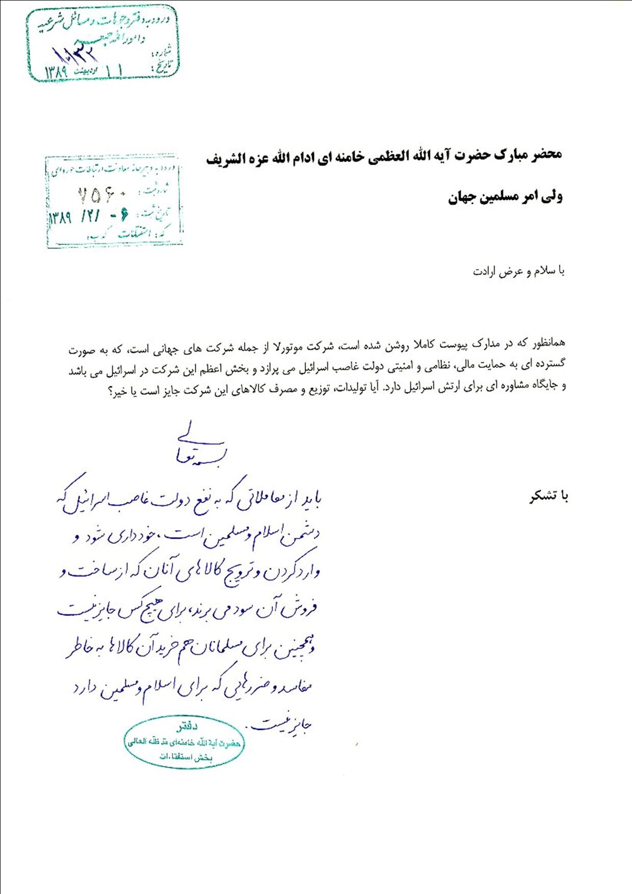 مقام معظم رهبری در این فتوا که در پاسخ به استفاتا در مورد موتورولا ضمن ارائه اسناد صهیونیستی بودن آن صادر شده است، وارد کردن و ترویج هر کالایی که منجر به هرگونه سود بردن رژیم صهیونیستی باشد را تحریم کردند.