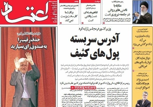 روزنامه اعتماد با تیتر «آدرس سربسته پول های کثیف» به استقبال جلسه یکشنبه بهارستان رفت و تلاش کرد با توجه به برخی اظهارات و اشاره های نامشخص وزیر در جلسه 2 روز گذشته، به نوعی از پرداختن به موضوع «عدم ارائه سند برای پول های کثیف از سوی وزیر کشور» فرار کند.