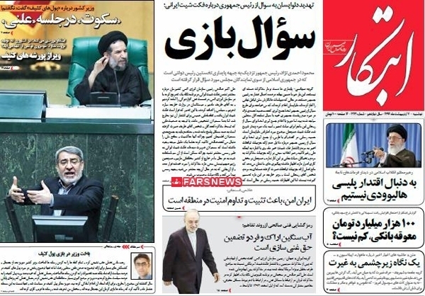 «سکوت در جلسه علنی» نیز عنوان تیتر روزنامه ابتکار درباره جلسه روز یکشنبه بهارستان است. این روزنامه نیز تلاش کرد با انتخاب این تیتر، غیر علنی نبودن جلسه دیروز را دلیل عدم بیان اظهارات جدی وزیر درباره پول های کثیف عنوان کند.