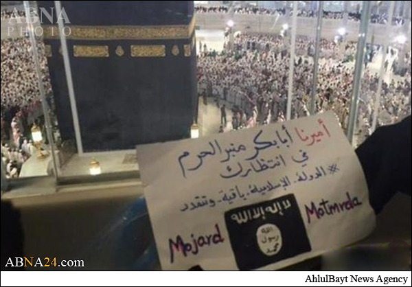 براساس این گزارش، یکی از اعضای گروه تروریستی داعش این دست نوشته که منقش به پرچم داعش است را از پشت بام رواقهای اطراف کعبه به روشی ماهرانه در دستان خود نگهداشته و از آن عکسبرداری کرده است.