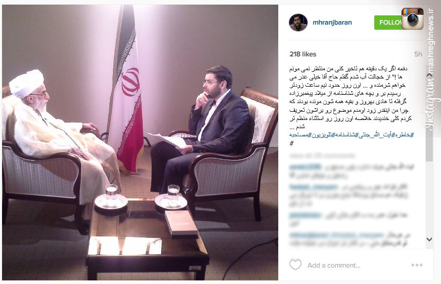 نخستین مصاحبه ام با آیت الله جنتی که البته بعد از دو سه ماه رایزنی و گپ و گفت با ایشون تونستم راضی شان کنم متاسفانه با تاخیر پانزده دقیقه ای بنده آغاز شد بنده خدا پیرمرد معطل شد و هیچی هم به من نگفت بعد از اینکه بنا به دلایلی آن مصاحبه به پخش نرسید چند ماه بعد قرار بعدی را گذاشتیم.