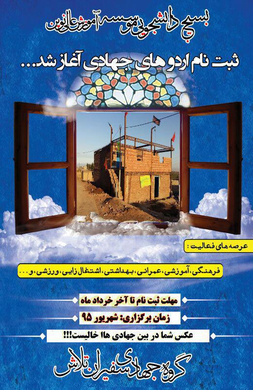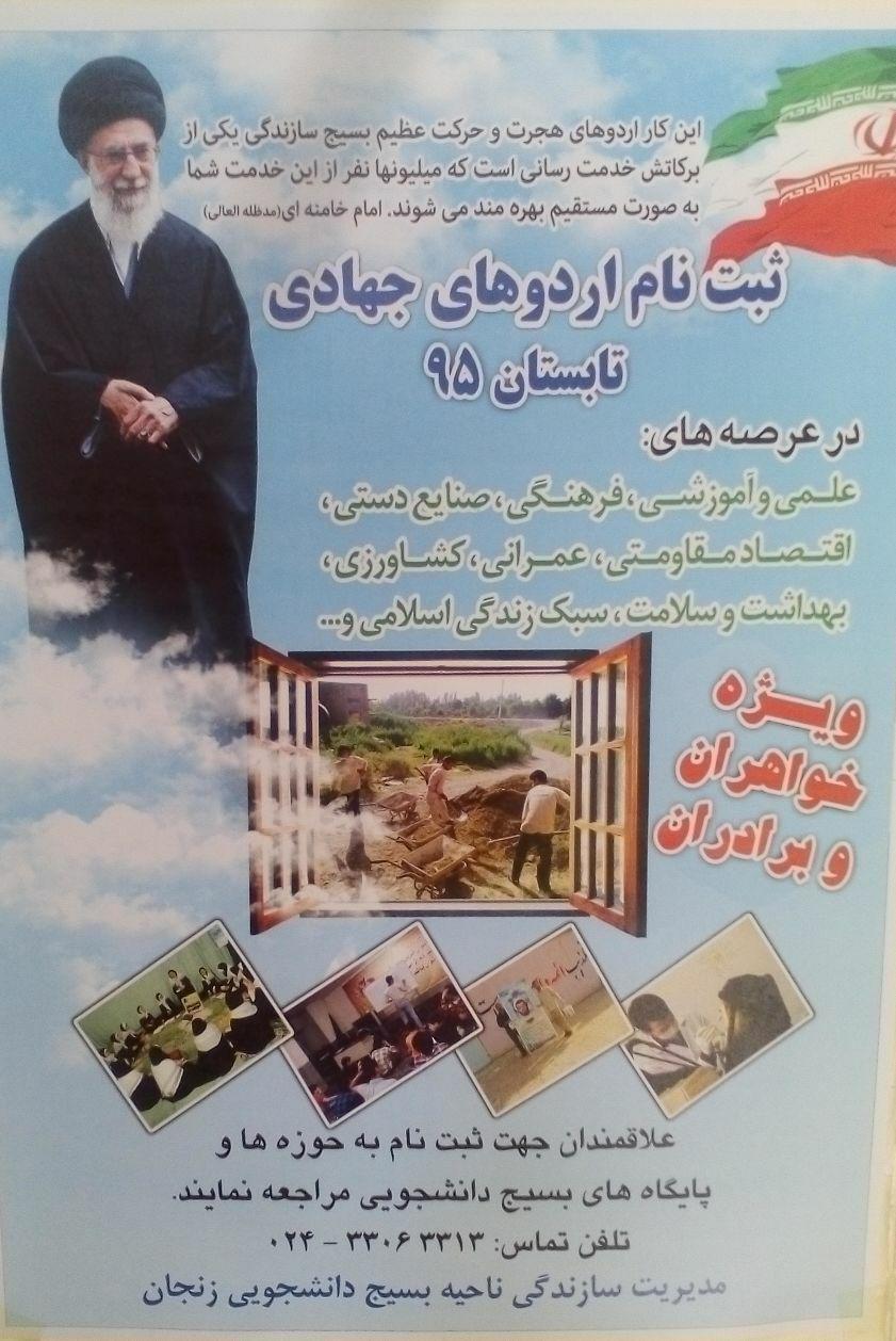 | 14 | بسیج دانشجویی زنجان | تابستان 95 | زنجان | فرهنگی، عمرانی، بهداشتی، اشتغال زایی، ورزشی و اقتصاد مقاومتی |