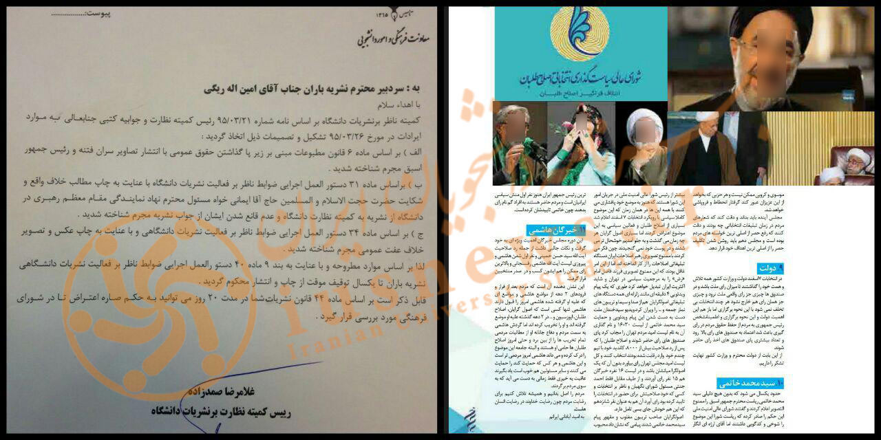 علت توقیف نشریه "باران" به سردبیری امین الله ریگی، انتشار تصاویر سران فتنه بود که پیشتر از سوی مراجع قانونی کشور ممنوع اعلام شده است.