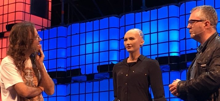 در اجلاس امسال گرتزول دانشمند ارشد هانسون روباتیک گوشهای از توانمندیهای این روبات هوشمند را به تصویر کشید. در مراسم معرفی این روبات، بن گرتزول و مایک بوتچر نویسنده سایت تککرانچ به روی صحنه رفتند. در این زمان سوفیا به آنها خوشآمد گفت و سر خود را برای باتچر تکان داد، در حالی که یک ارتباط چشمی با گرتزل برقرار کرد. در ادامه به آنها گفت: «من سوفیا هستم. جدیدترین روبات هانسون روباتیک. خیلی خوشحال هستم که در اجلاس وب در لیسبون حضور پیدا کردهام.» باتچر و گرتزول از سوفیا سوال کردند آیا تا به حال احساساتی شده است؟ سوفیا گفت: «هیجانبرانگیز است. بله هوش مصنوعی و روباتها آینده هستند و من هر دو اینها هستم. همین موضوع من را ذوق زده کرده است.» در ادامه لبخندی زد. جواب دقیقی به این سوال نداد.