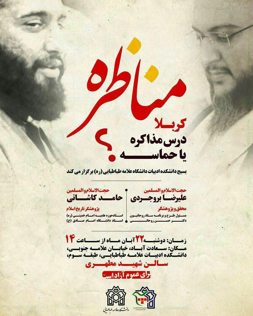 دوشنبه 23 آبان ماه مناظره‌ای در دانشگاه علامه طباطبایی با عنوان کربلا درس مذاکره یا حماسه برگذار شد. در این مناظره حجت الاسلام علیرضا بروجردی و حجت الاسلام حامد کاشانی به بحث و تبادل نظر پرداختند.