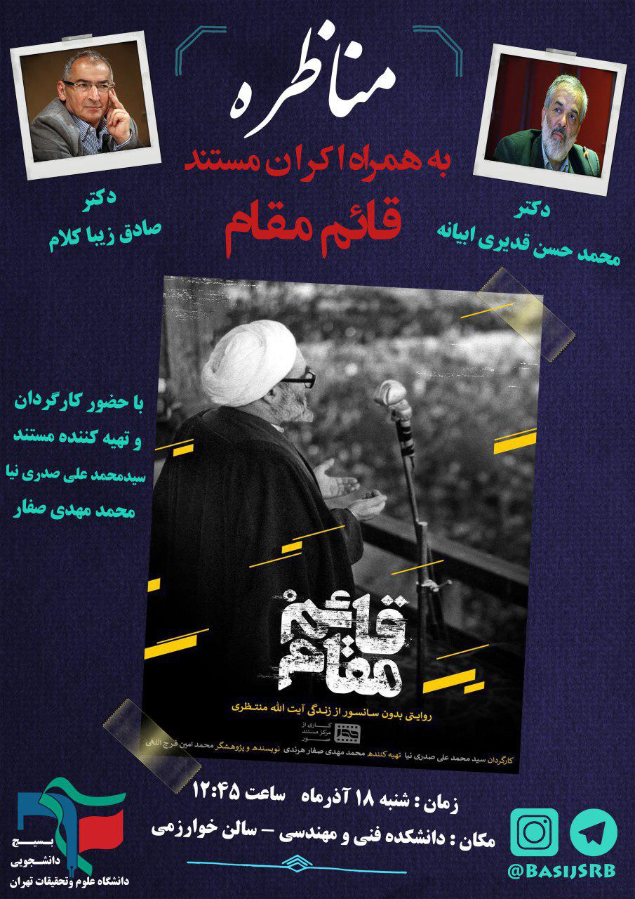 | 4 | دانشگاه علوم و تحقیقات | مناظره قدیری ابیانه و زیباکلام + اکران مستند «قائم مقام» | اینجا |