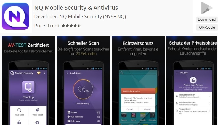 NQ Mobile Security یکی از ضدبدافزارهای معروفی است که موفق شده است جایزه محبوب‌ترین برنامه ضدبدافزاری را از آن خود کند. محافظت در برابر بدافزارها، ضد هرزنامه، محافظت در برابر سایت‌های مخرب، قابلیت حذف برنامه‌ها و... از ویژگی‌های این ضدویروس است.