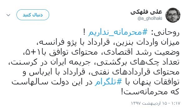 این متن از روحانی با هشتگهای #محرمانه_نداریم #حکم_سفارشی #جریان_آزاد_اطلاعات و #حق_انتخاب تگ شده است.