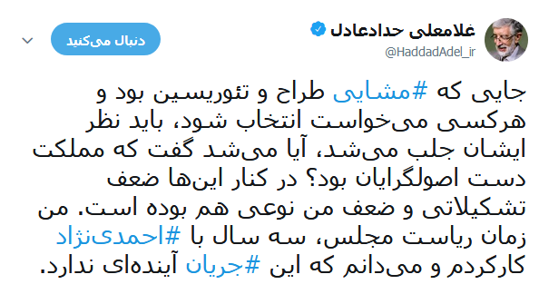 غلامعلی حدادعادل عضو مجمع تشخیص مصلحت نظام در توییتر خود درباره جریان احمدی نژادی ها نوشت: