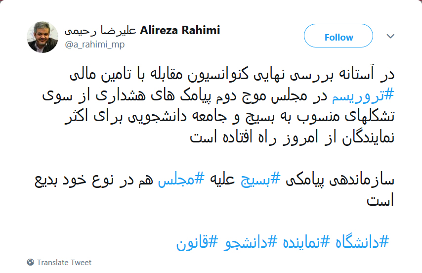 علیرضا رحیمی نماینده مردم تهران در توییتی به پیامکهای دانشجویان واکنش نشان داد. وی در این توییت مدعی شد، بسیج دانشجویی در سازماندهی ارسال پیامکهای دانشجویان به نمایندگان مجلس نقش داشته است.