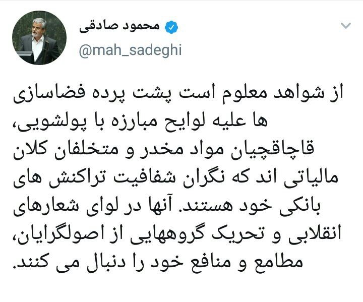اما برخی نمایندگان در انحراف افکار عمومی فعالیت بیشتری را داشتند. علیرضا رحیمی نماینده مردم تهران در پیام توییتری این موج را علیه مجلس توصیف کرد و همچنین در اظهارنظر دیگری شهر مشهد را مرکز طراحی پیامکها دانست. سهیلا جلودار زاده دیگر نماینده مجلس و از اعضای لیست امید برخی از این پیامها را توهینآمیز و برخی که متعلق به نمایندگان تشکلهای دانشجویی بود را محترمانه دانست؛ اما پروانه مافی پیامها را حاوی کلمات توهینآمیز اعلام کرد. علی ادیانی راد هم با این استدلال که تلفن همراه وسیله شخصی است سعی در تخریب این موج نمود علی لاریجانی و محمدرضا تابش نیز واکنشهای مشابهی به این اقدام داشتند. محمود صادقی نماینده اصلاحطلب و پرحاشیه فراکسیون امید در پیامی توییتری فضاسازیهای علیه تصویب لوایح مربوط به FATF را به قاچاقچیان نسبت داد و بدون هیچ مبنایی اتهامات بسیاری را به معترضان این لوایح نسبت داد.