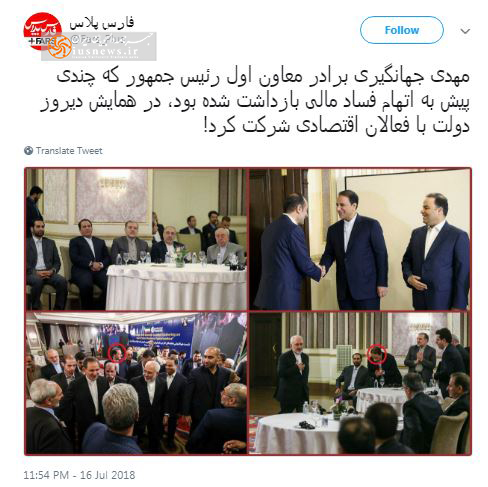 مهدی جهانگیری برادر معاون اول رئیس جمهور که چندی پیش به اتهام فساد مالی بازداشت شده بود، در همایش دیروز دولت با فعالان اقتصادی شرکت کرد!