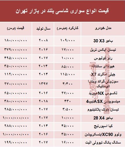 آنچه در زیر میآید قیمت روز انواع خودروهای کارکرده شاسی بلند در سطح بازار پایتخت طی امرداد ماه 97 است.