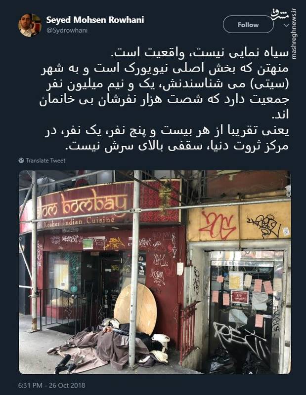 یک فعال رسانه ای طی توییتی با انتشار تصویری از شهر منهتن آمریکا و تعداد بی خانمانهای آن شهر نوشت: