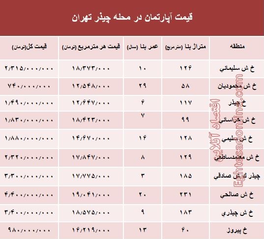 آنچه در زیر میآید جدول معاملات انجام شده آپارتمان در محله چیذر تهران طی بهمن ماه ۹۷ میباشد.