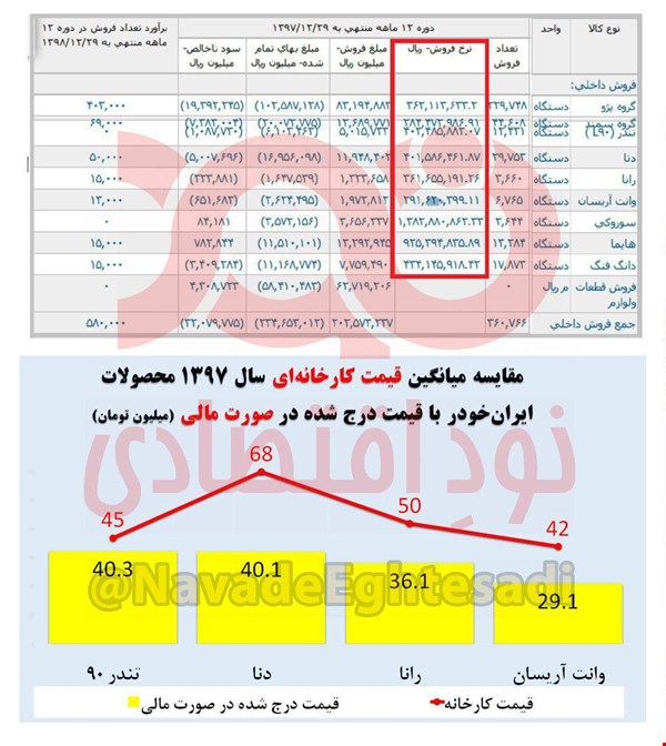 برای مثال درحالی که میانگین قیمت خودرو تندر ۹۰ در سال ۹۷ حدود ۴۵ میلیون تومان، دنا ۶۸ میلیون تومان، رانا ۵۰ میلیون و وانت آریسان حدود ۴۲ میلیون تومان بود، اما در صورت مالی شرکت، قیمت این خودروها به ترتیب ۴۰.۳ میلیون، ۴۰.۱ میلیون، ۳۶.۱ میلیون و ۲۹.۱ میلیون تومان درج شده است.