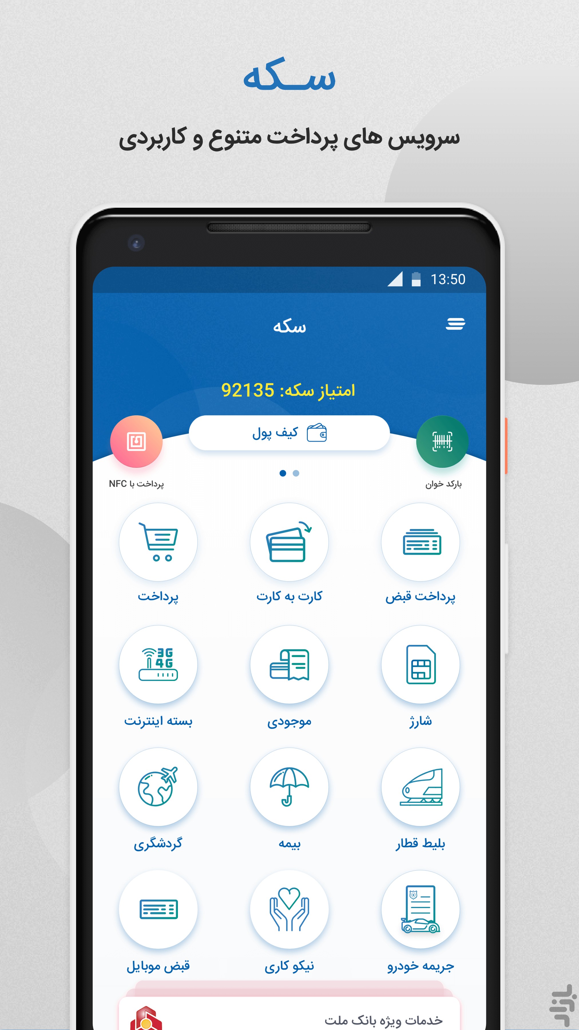 اپلیکیشن سکه متعلق به شرکت به پرداخت ملت از زیرمجموعههای بانک ملت است. نسخه جدید و فعلی این برنامه در سال گذشته عرضه شد. مهمترین ویژگی این برنامه پشتیبانی از قابلیت پرداخت با NFC است. با استفاده از این قابلیت در صورتی که کارت بانک ملت را در این برنامه ذخیره کرده باشید، میتوانید هنگام خرید از پایانههای فروشگاهی شرکت به پرداخت ملت با نزدیک کردن گوشی به پایانه و وارد کردن رمز دوم بدون نیاز به کشیدن یا همراه داشتن کارت، خرید خود را انجام دهید. این قابلیت فقط با کارتهای بانک ملت قابل انجام است. علاوه بر این امکان پرداخت از طریق کد QR نیز در این برنامه وجود دارد.