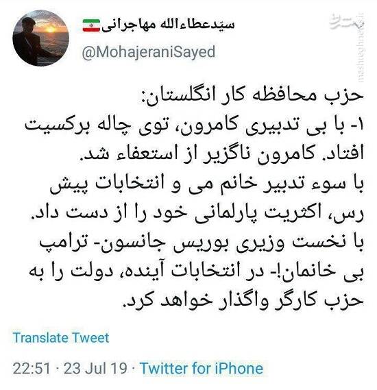 به گزارش مشرق، بوریس جانسون نخست وزیر جدید بریتانیا شد. در همین راستا سید عطاالله مهاجرانی، وزیر ارشاد دولت اصلاحات در صفحه توییتر خود نوشت:
