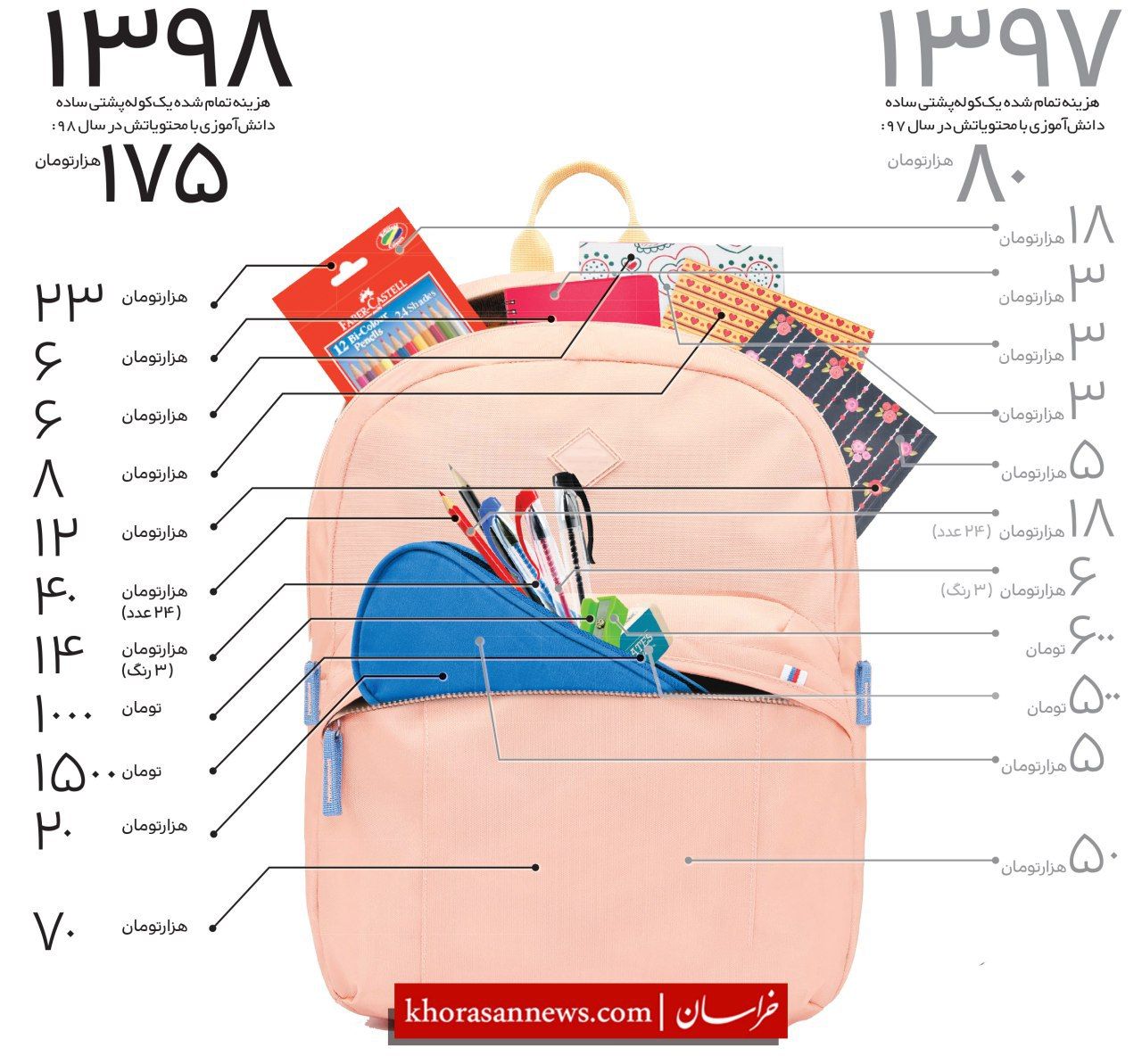 در ادامه تفاوت هزینه تمام شده یک کوله پشتی دانش آموزی با محتویاتش در سال 97 و 98 را مشاهده میکنید.