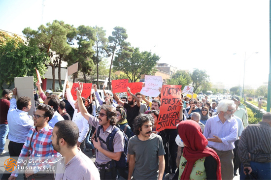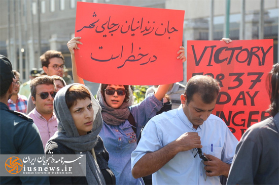 مرضیه امیری در تجمع غیرقانونی 11 اردیبهشت 1398 در سمت چپ تصویر با پلاکارد به دست (مرضیه امیری در همین تجمع به دلیل شعارها و رفتارهای ساختار شکنانه بازداشت شد)