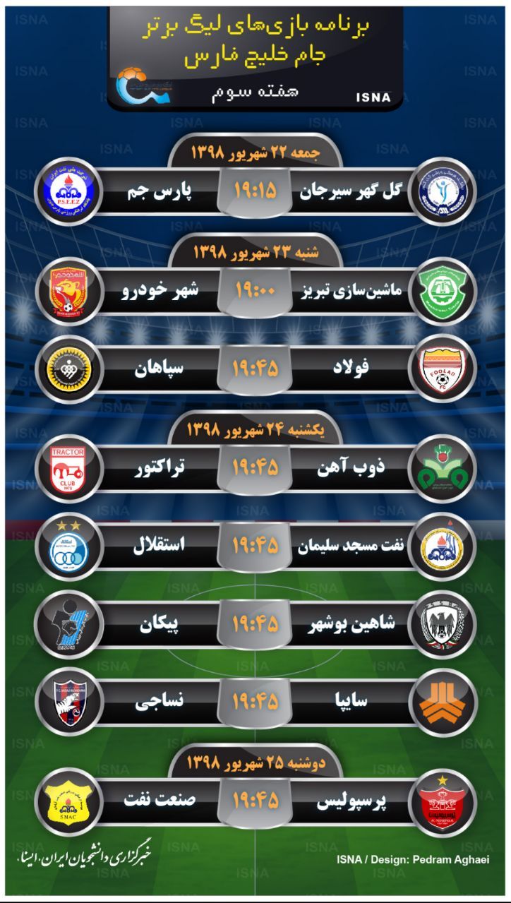 برنامه کامل بازی های هفته سوم لیگ برتر به شرح ذیل است: