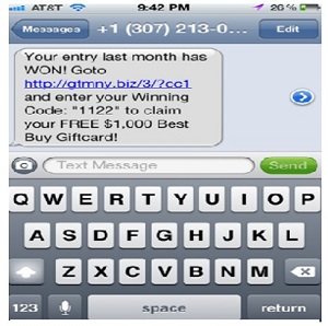 یکی دیگر از بردارهای محبوب در حملات فیشینگ، ارسال پیام کوتاه است. این بردار حمله smishing نام دارد. بردار حمله اسمیشینگ عملکردی یکسان با فیشینگ سنتی دارد، با این تفاوت که به جای دریافت ایمیل، قربانی یک پیام کوتاه دریافت میکند. در این پیام کوتاه به کاربر اعلام میشود نام او جزء برندگان حساب بانکی است و برای دریافت جایزه باید از طریق پیام کوتاه مشخصات حساب بانکی خود را ارسال کند. شکل 5 نمونه یک حمله اسمیشینگ را نشان میدهد که قربانی برنده لاتاری شده و باید پیوند نشان داده شده را باز کند تا بتواند جایزه خود را دریافت کند.
