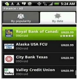روش دیگر حمله به کاربران با استفاده از فروشگاه برنامههای کاربردی است. این بردار حمله، فیشینگ برنامه کاربردی (application phishing) نام دارد. یک مثال ساده از فیشینگ برنامههای کاربردی Android 09Droid است که برای جمعآوری اطلاعات حسابهای بانکی طراحی شده بود. 09Droid از جمله برنامههایی بود که قربانیان بهطور مستقیم از فروشگاه اندروید آنرا دانلود کرده بودند. شکل 2 تصویری از برنامه جعلی 09Droid را نشان میدهد.