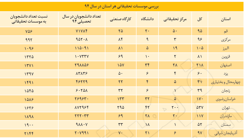 در این بین هر چند استان تهران دارای بیشترین مراکز تحقیقاتی در بین استانهای دیگر است، اما بهدلیل تراکم بیش از 873 هزار و 964 دانشجو در این استان، به ازای هر 1626 دانشجو یک موسسه تحقیقاتی وجود دارد و به این ترتیب تهران در رتبه دهم استانهای برخوردار در زمینه موسسه تحقیقاتی قرار دارد. اما در این بین پنج استان ایلام، کهگیلویهوبویراحمد، هرمزگان، کردستان و سیستانوبلوچستان بدترین وضعیت را با توجه به تعداد موسسات تحقیقاتی و دانشجویان دارند. سیستانوبلوچستان با داشتن 101هزار و 822 دانشجو تنها دارای 20 موسسه تحقیقاتی است و این قضیه به این معناست که به ازای هر 5091 دانشجو تنها یک موسسه تحقیقاتی در این استان قرار دارد. با این حال این استان وضعیت بهتری را نسبت به چهار استان دیگر دارد. کردستان به ازای هر 5243 دانشجو، هرمزگان به ازای هر 5547 دانشجو، کهگیلویهوبویراحمد به ازای هر 6218 دانشجو، ایلام به ازای هر ۷۹۴۰ دانشجو تنها دارای یک موسسه تحقیقاتی هستند. با این حساب بین استان قم با عنوان استانی که بهترین نسبت را بین تعداد دانشجویان و موسسات تحقیقاتی دارد با ایلام بهعنوان استانی با کمترین نسبت برخورداری از موسسات تحقیقاتی، اختلافی 7هزار و 184 نفری وجود دارد.