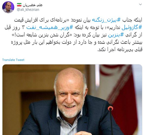 اینکه جناب بیژن زنگنه بیان نموده: «برنامهای برای افزایش قیمت گازوئیل نداریم»؛ با توجه به اینکه وزیرهمیشه نفت ۳ روز قبل از گرانی بنزین نیز بیان کرده بود: «گران شدن بنزین شایعه است!» بیشتر باعث نگرانی شده و جا دارد از دولت بخواهیم این بار مثل پروژه قبلی بیبرنامه اجرا نکند.