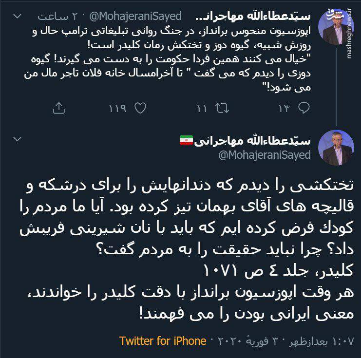 سید عطاءالله مهاجرانی، وزیر فرهنگ و ارشاد اسلامی دولت اصلاحات در صفحه شخصی خود در توییتر درباره برانداز های ضد انقلاب نوشت: