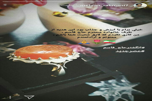به گزارش «خبرنامه دانشجویان ایران» به نقل از مهر، مهران رحمانی فینالیست عصر جدید در صفحه شخصی خود در اینستاگرام درباره اهدای انگشتر سردار سلیمانی از طرف خانواده ایشان، نوشت: خیلی برایم با ارزش و جذاب بود که این هدیه از طرف خانواده حاج قاسم، به من داده شد هرچند من کاری نکردم که لایق محبت شما باشم، ممنونم و ارادتمندم.