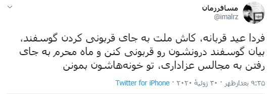 این افراد با هر اقدام مذهبی و نه تنها محرم مخالفت می کنند، یکی از این افراد نوشته است:«کاش ملت به جای قرونی کردن گوشفند گوسفند درونشون رو قربونی کنند و ماه محرم به جای رفتن به مجالس عزاداری، تو خونه هاشون بمونن.» این فرد نه تنها از ماه محرم چیزی نمی داند بلکه از عید قربان و مراسم پر برکت قربانی هم چیزی نمی فهمد و تنها الفاظ را بدون آنکه ربطی به یکدیگر داشته باشند پشت سر هم می آورد، در روزهایی که برخی از هموطنانمان نیازمند همین گوشت های قربانی هستند فرد مذکور که احتمالا از آلبانی در حال توئیت گذاشتن است از عدم قربانی کردن حمایت می کند! و از مردم می خواهد تا در خانه بمانند.