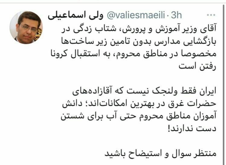 ولی اسماعیلی نماینده مجلس در توییت اعتراضی درخصوص بازگشایی مدارس به مسئولین آموزش و پرورش هشدار داد.