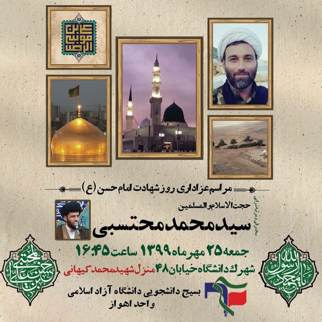 بسیج دانشجویی دانشگاه آزاد اهواز ۲۵ مهرماه، مراسم عزاداری روز شهادت امام حسن (ع) را در منزل شهید مدافع حرم، محمد کیهانی برگزار میکند.