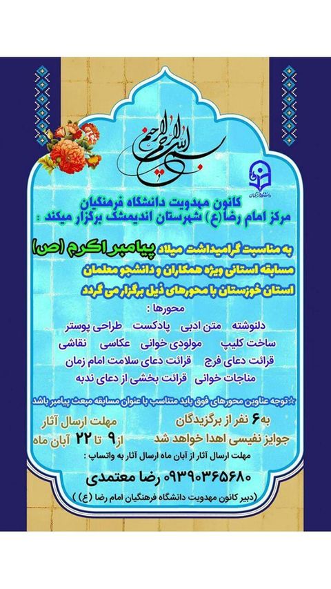 به گزارش «خبرنامه دانشجویان ایران»؛ کـانـون مـهـدویت دانشگاه فرهنگیان امـامرضــا(علیهالسلام) شهرستان اندیمشک به مناسبت گرامیداشت میلاد پیامبرگرامیاسلام(ص) مسابقه استانی در دو بخش معلمان و دانشجومعلمان ویــــژه اسـتـان خـــوزسـتــان برگزار میکند.