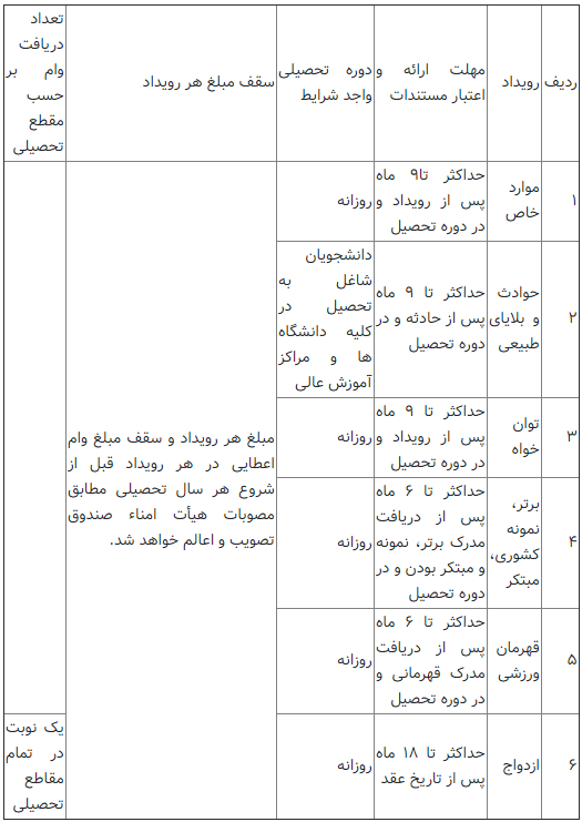 تبصره:دانشجو می تواند در هر نیمسال منحصرا از یک رویداد جهت دریافت وام ضروری استفاده کند و استفاده از هر رویداد در طول مقطع تحصیلی، صرفا یک بار مجازاست.