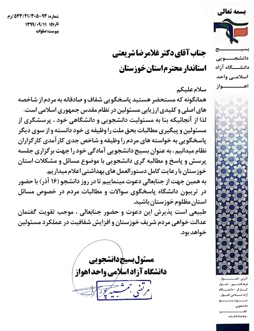 به همین جهت از جنابعالی دعوت مینماییم تا در روز دانشجو(۱۶ آذر) با حضور در تریبون دانشگاه پاسخگوی سوالات نمایندگان دانشجویان، جامعه ی دانشگاهی و مطالبات مردم در خصوص مسائل استان مظلوم خوزستان باشید.