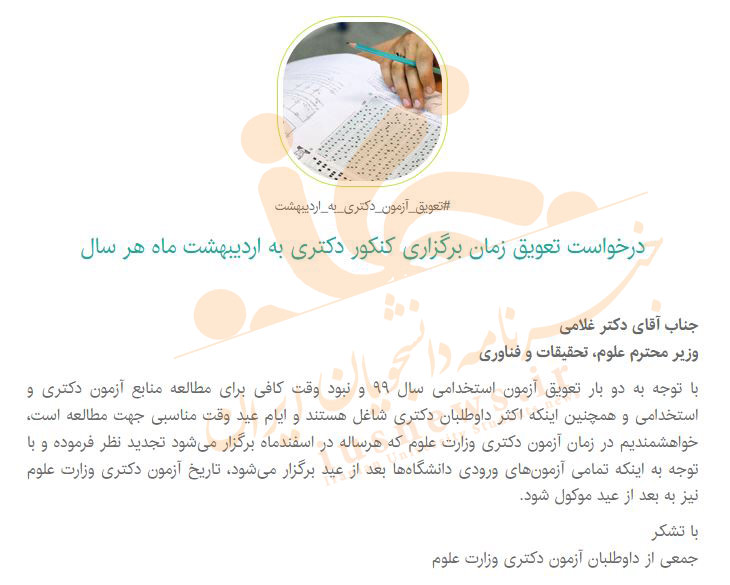 همچنین در بخش دیگر این نامه نیز آمده است: "همچنین اینکه اکثر داوطلبان دکتری شاغل هستند و ایام عید وقت مناسبی جهت مطالعه است، خواهشمندیم در زمان آزمون دکتری وزارت علوم که هرساله در اسفندماه برگزار میشود تجدید نظر فرموده و با توجه به اینکه تمامی آزمونهای ورودی دانشگاهها بعد از عید برگزار میشود، تاریخ آزمون دکتری وزارت علوم نیز به بعد از عید موکول شود."