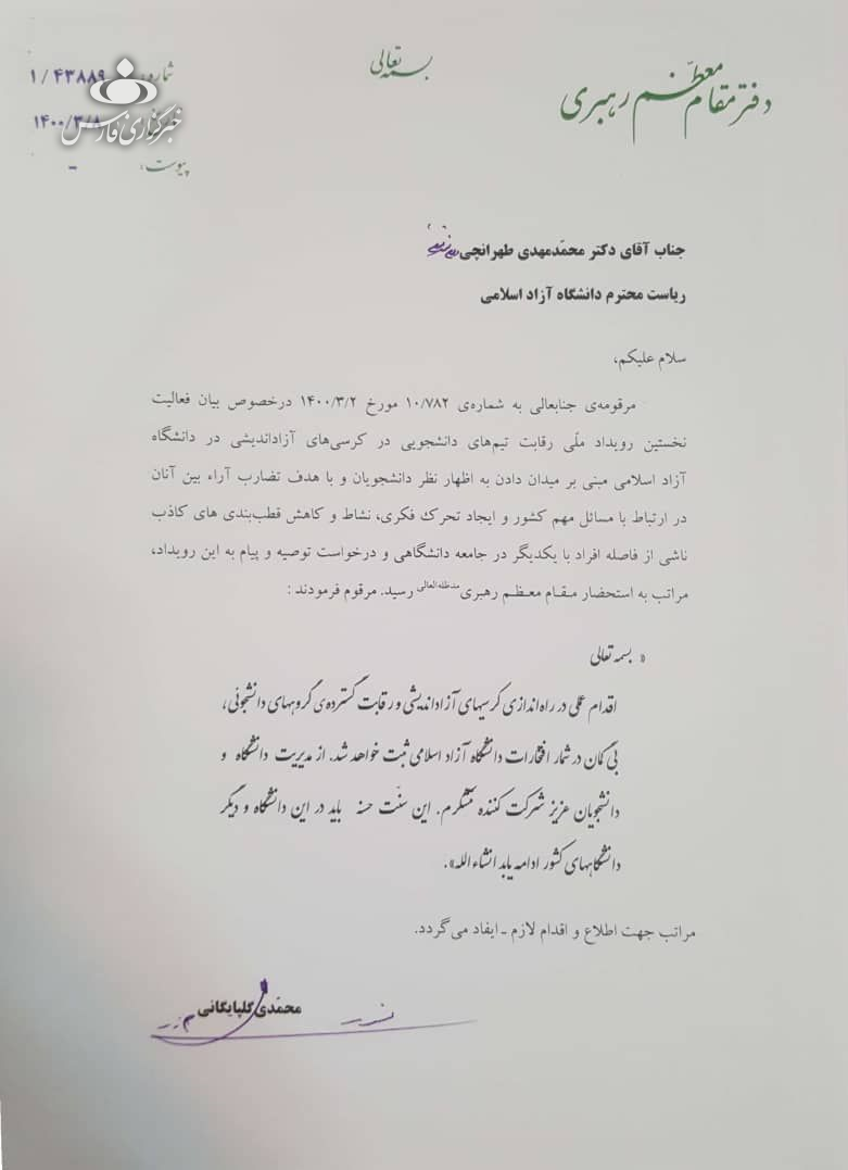 رهبر معظم انقلاب طی پیامی به رویداد ملی کرسی‌های آزاد اندیشی دانشجویان که در دانشگاه آزاد برگزار شد، تاکید کردند: این سنت حسنه باید در این دانشگاه و دانشگاه‌های دیگر ادامه یابد.