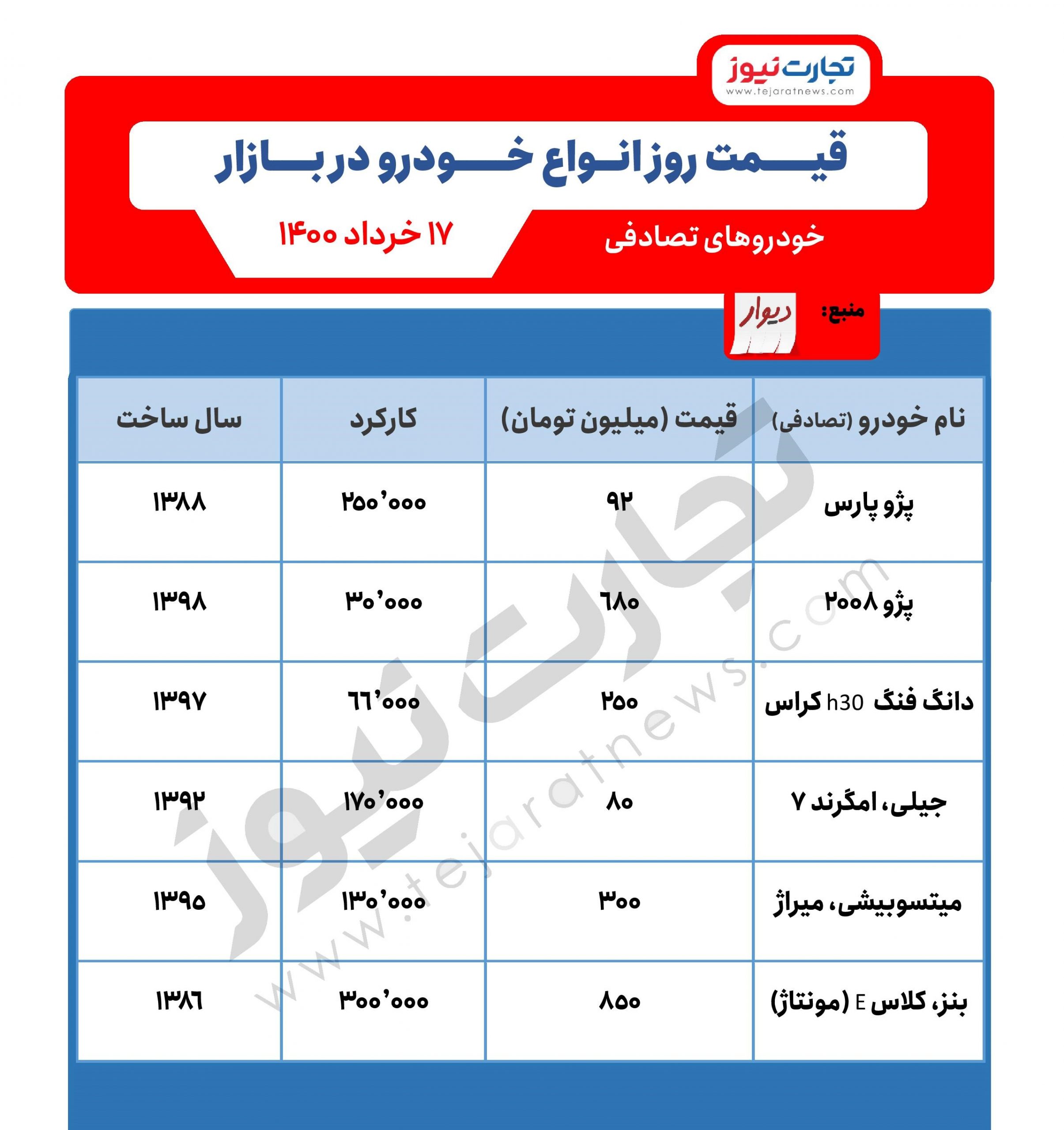 بر اساس دادههای دریافتی و آگهیهای ثبت شده در سایتهای اینترنتی، قیمت برخی از خودروهای تصادفی به دست آمده است.