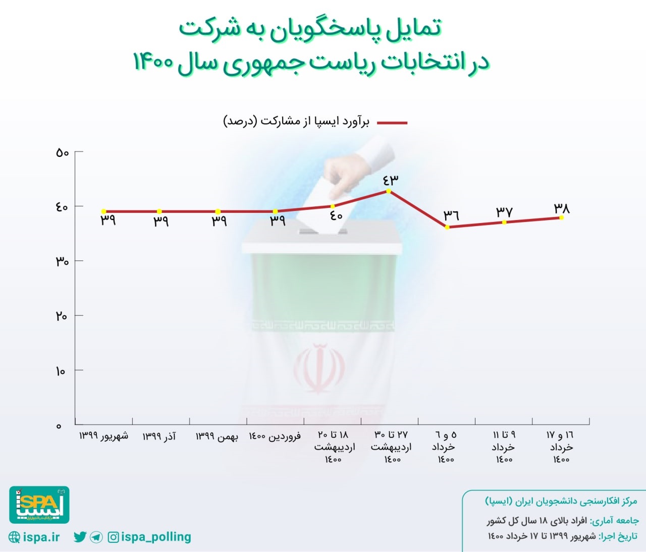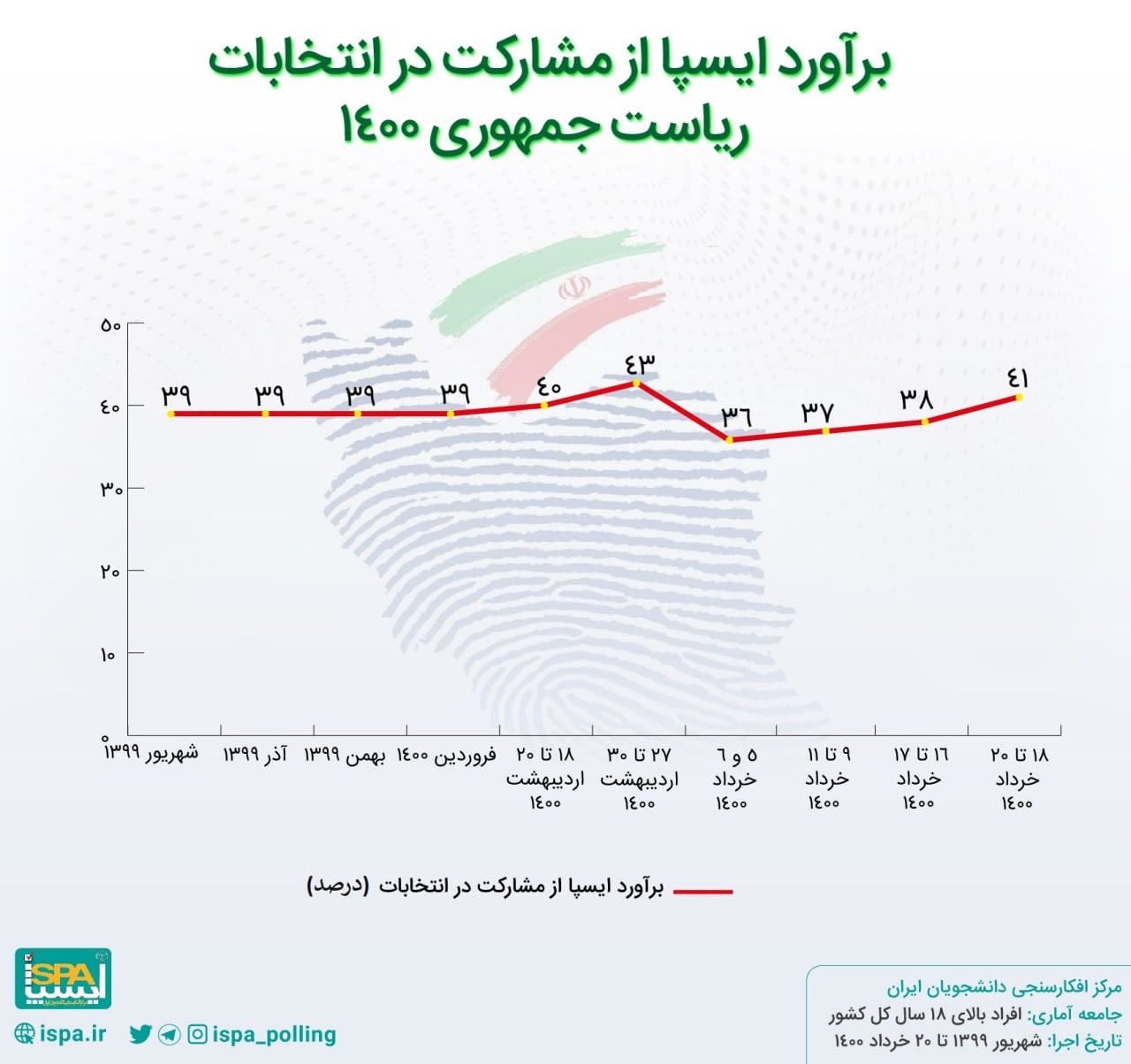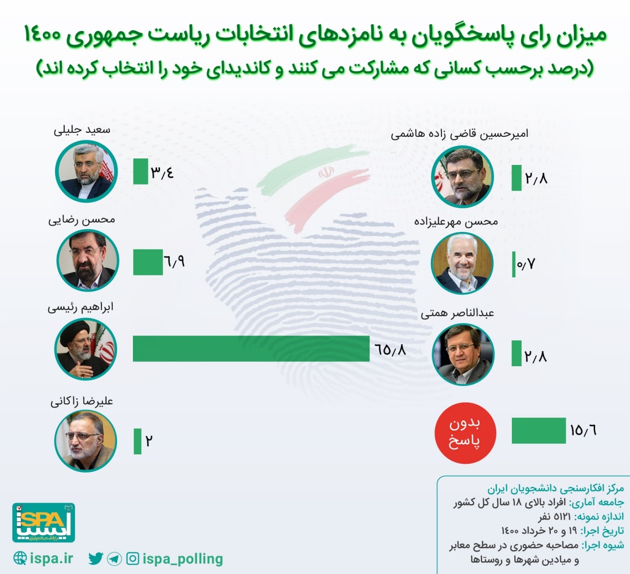 ایسپا نظرسنجی (موج دهم انتخابات ریاست جمهوری) را با جامعه آماری افراد بالای ۱۸ سال کل کشور (شهر و روستا) و اندازه نمونه ۵۱۲۱ نفر از طریق مصاحبه حضوری در میادین و معابر شهرها و روستاها در تاریخ ۱۹ و ۲۰ خرداد ۱۴۰۰ اجرا کرده است.
