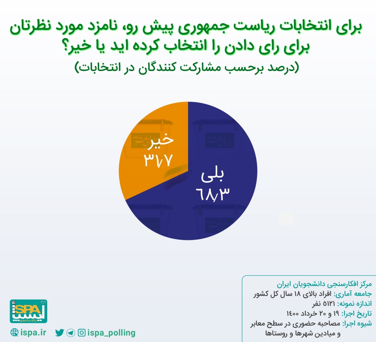 ایسپا نظرسنجی را با جامعه آماری افراد بالای ۱۸ سال کل کشور (شهر و روستا) و اندازه نمونه ۵۱۲۱ نفر از طریق مصاحبه حضوری در میادین و معابر شهرها و روستاها در تاریخ ۱۹ و ۲۰ خرداد ۱۴۰۰ اجرا کرده است.