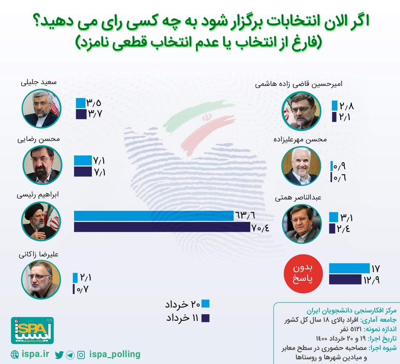 ایسپا موج دهم نظرسنجی انتخابات ریاست جمهوری را با جامعه آماری افراد بالای ۱۸ سال کل کشور (شهر و روستا) و اندازه نمونه ۵۱۲۱ نفر از طریق مصاحبه حضوری در میادین و معابر شهرها و روستاها در تاریخ ۱۹ و ۲۰ خرداد ۱۴۰۰ اجرا کرده است.